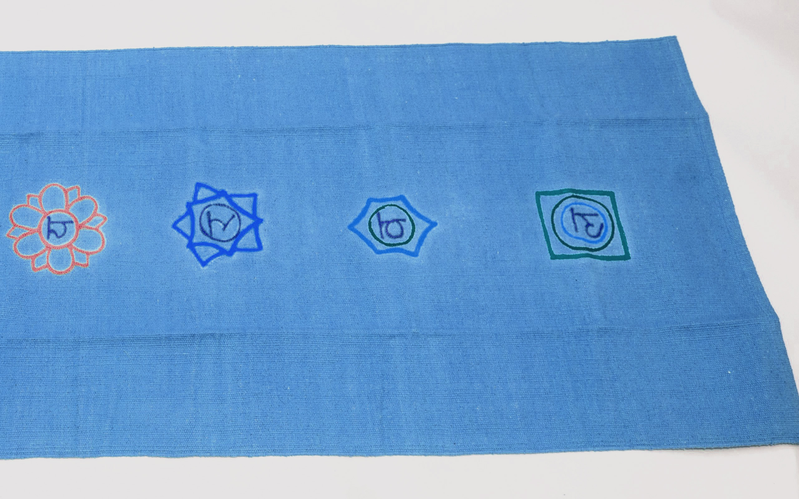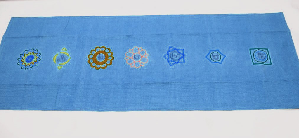 - Simbolurile celor șapte chakre sunt brodate pe un fond simplu, albastru