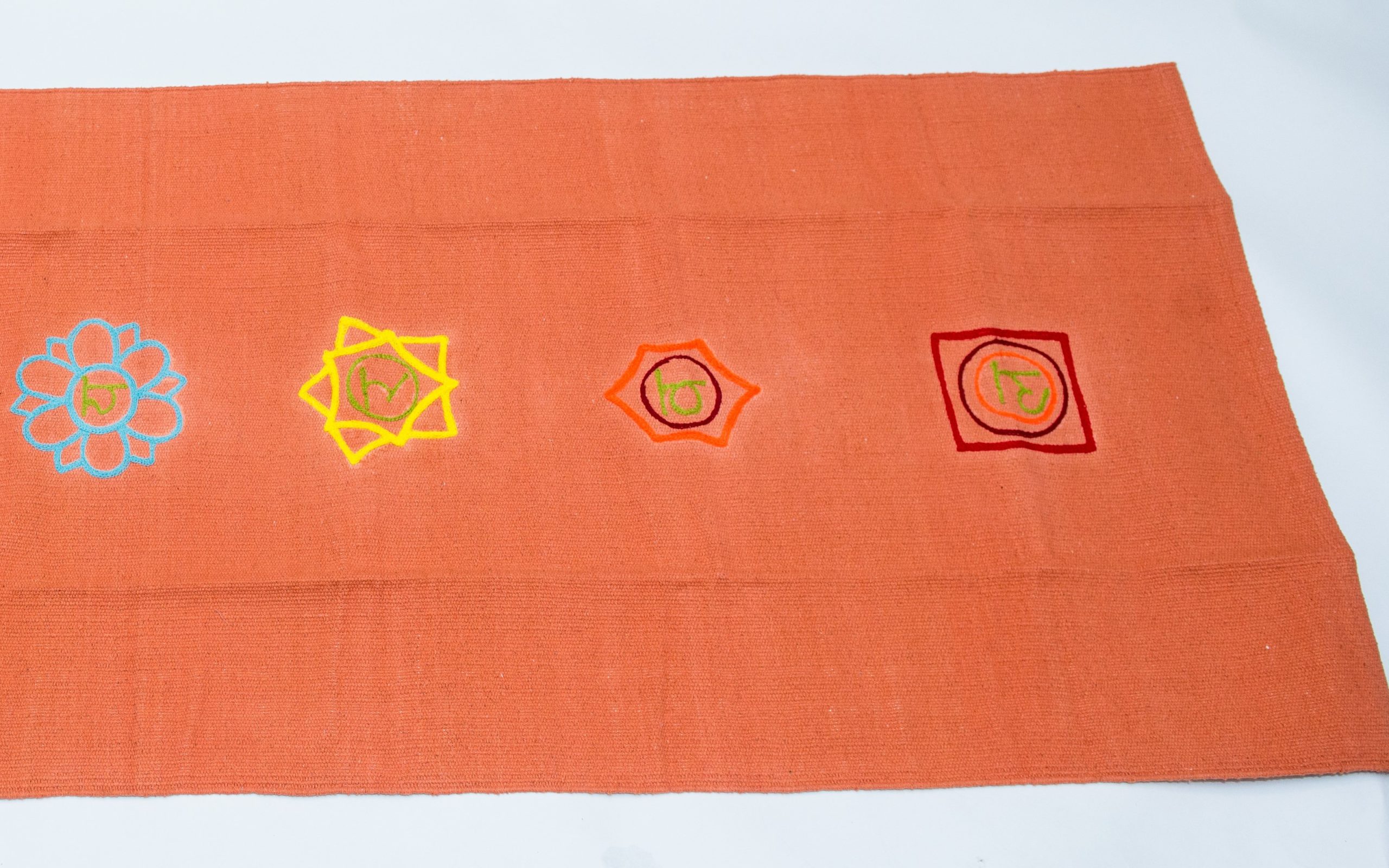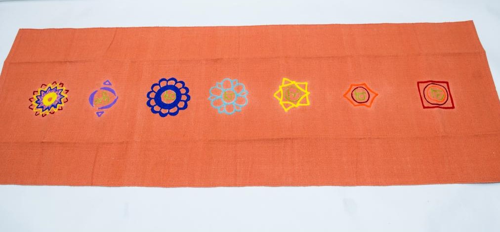 - Simbolurile celor șapte chakre sunt brodate pe un fond simplu, portocaliu